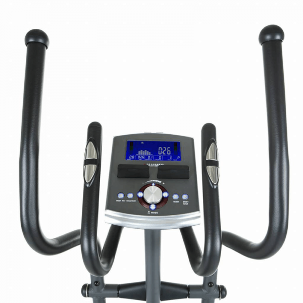Main product information: Wear-resistant electronic magnetic braking system with approx. 12 kg flywheel suitable for high speeds Power in Watt: 10 - 350 Watt (at 60 RPM independent of RPM to 400 Watt (at 80 rpm, depending on speed) Class HA elliptical cross trainer according to DIN EN 957-1 / 9 Training computer with iConsole + app controllable via smartphone or tablet Full body workout with optional fixed and movable handles 4 health-oriented heart rate programs 12 mountain and valley programs from beginner to fitness athlete Measurement of body fat percentage with information about percentage of body fat in% (BMR) and BMI 4 user programs for individual training of all people in the family Individually adjustable resistance via buttons (manual mode) Bright color LCD display with illuminated blue background color Contact sensors on the handlebar for pulse measurement Integrated pulse receiver for the Polar T34 chest strap and the Finnlo chest strap (optionally available) Dynamic, modern, eye-catching design with rounded accents Whisper-quiet belt drive and high-quality ball bearings for low-noise training (suitable for use in a flat or while your kids are sleeping) Power supply: 230V, 50Hz Foot plate distance: 14 cm Stride length: 43 cm Color: silver / anthracite / red Weight of the device: 53.5 kg Maximum user weight: 130 kg Dimensions built up (L x W x H in cm): 163 x 53 x 164