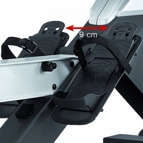 SPECIFICATIES Geïntegreerde ontvanger voor draadloze hartslagmeting (borstband niet meegeleverd) In positie verstelbare trainingscomputer met extra lange houder Draaibare voetplaten met straps Premium aluminium telescopische buis voor uiterst soepel roeien Afstand tussen de voetplaten slechts 9 cm voor een realistische positie Comfortabele zitting ondersteund door kogellagers Inklapbaar Geïntegreerde transportrollen Gecombineerd weerstandsysteem op basis van lucht en magneet Weerstand via de handgrepen in te stellen Weerstand: RPM onafhankelijk Hoogte van de zitting is 50 cm voor een natuurlijke roeibeweging Stroomvoorziening: 230 V Maximaal gebruikersgewicht: 150 kg. Klasse SA (volgens DIN EN 957 - 1/7) Afmetingen ingeklapt (L x B x H in cm): 148 x 51 x 196 Afmetingen opgebouwd (L x B x H in cm): 249 x 51 x 98 Netto gewicht: 45.40 kg Kleur: zilver/zwart EAN: 4005251370403 Afmetingen van de doos (L x B x H in cm): 179 x 76 x 25 Bruto gewicht: 52.60 kg Lengte roeiframe: 135 cm